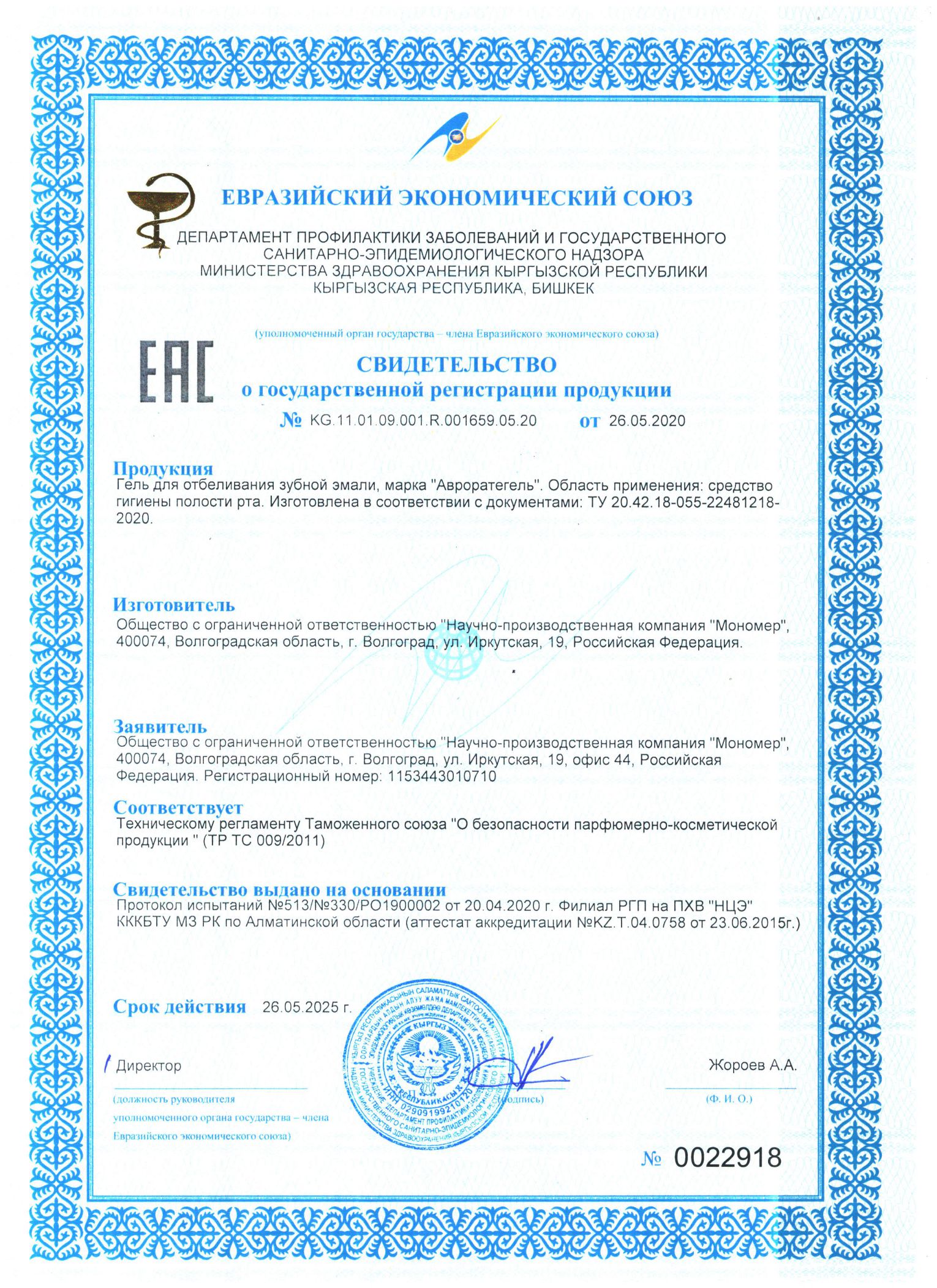 Сертификат: зубной гель для осветления эмали Авроратегель